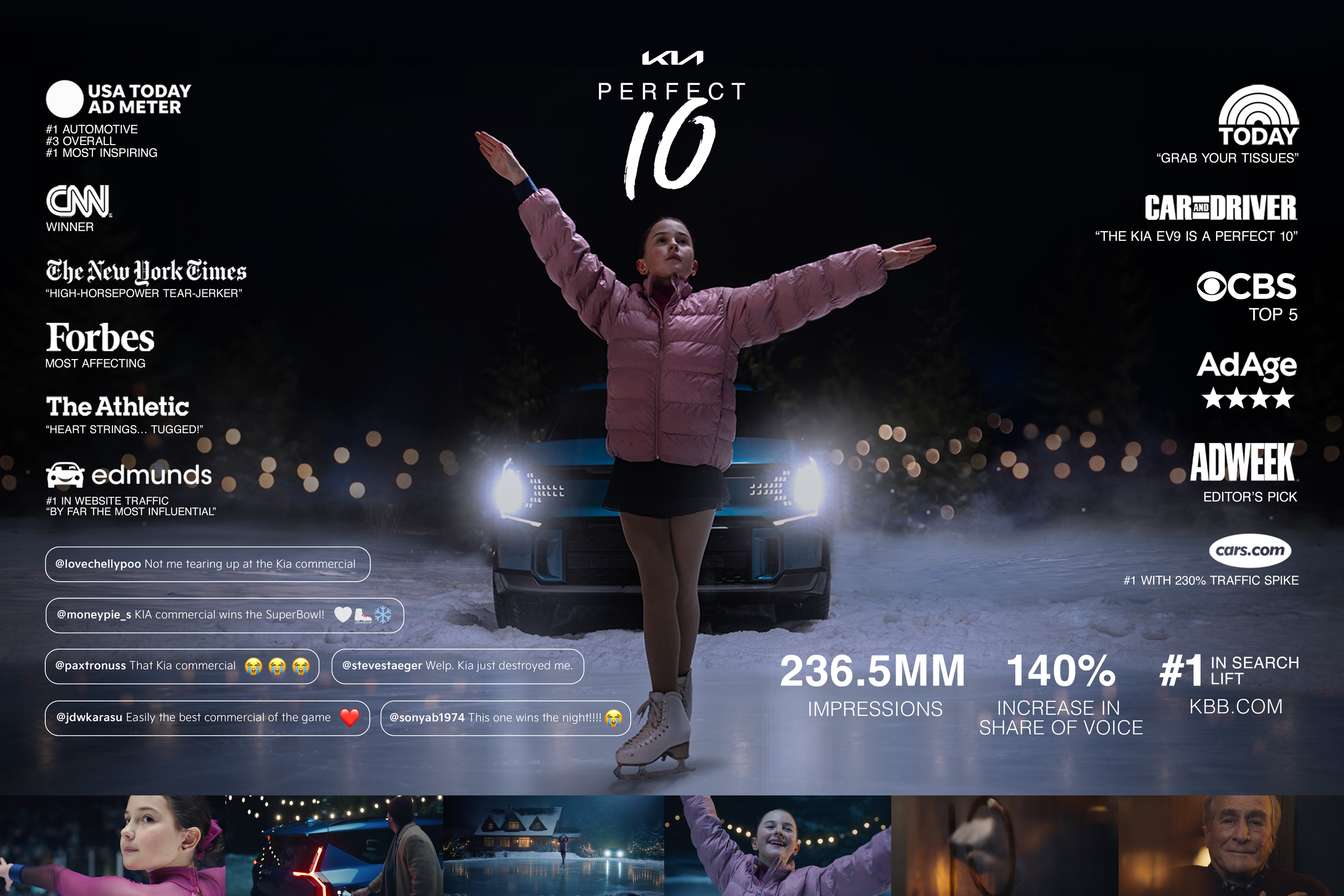 When the spot premiered on The Today Show, the hosts teared up, which set the mood for the thousands of emotional reactions to come when it aired during the Super Bowl. Thousands of tears were shed, ultimately earning it the #1 spot in Auto, #1 Most Inspiring, and #3 Overall on USA Today’s Ad Meter.